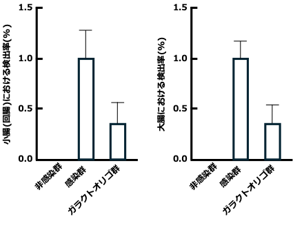 O157に感染させたマウスにガラクトオリゴ糖を投与した結果、回腸および結腸におけるO157の定着率がそれぞれ65%・62%低下した。腸粘膜層での菌数も有意に減少していました。