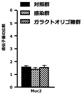 O157感染により抑制されていたMuc2の発現は、ガラクトオリゴ糖の摂取によって有意に回復し、健常群と同等レベルに近づいた