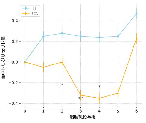 マウスに脂肪乳とフラクトオリゴ糖を摂取させた結果、血中トリグリセリド値の増加を抑制しました。
