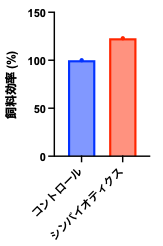 1か月間のシンバイオティクス投与(オリゴ糖:1-kestose+乳酸菌:L. plantarum FM8)により、飼料効率が対照群に比べて約23%向上した。