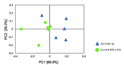 シンバイオティクス群と対照群の腸内微生物叢の構成に有意な違いが確認された。