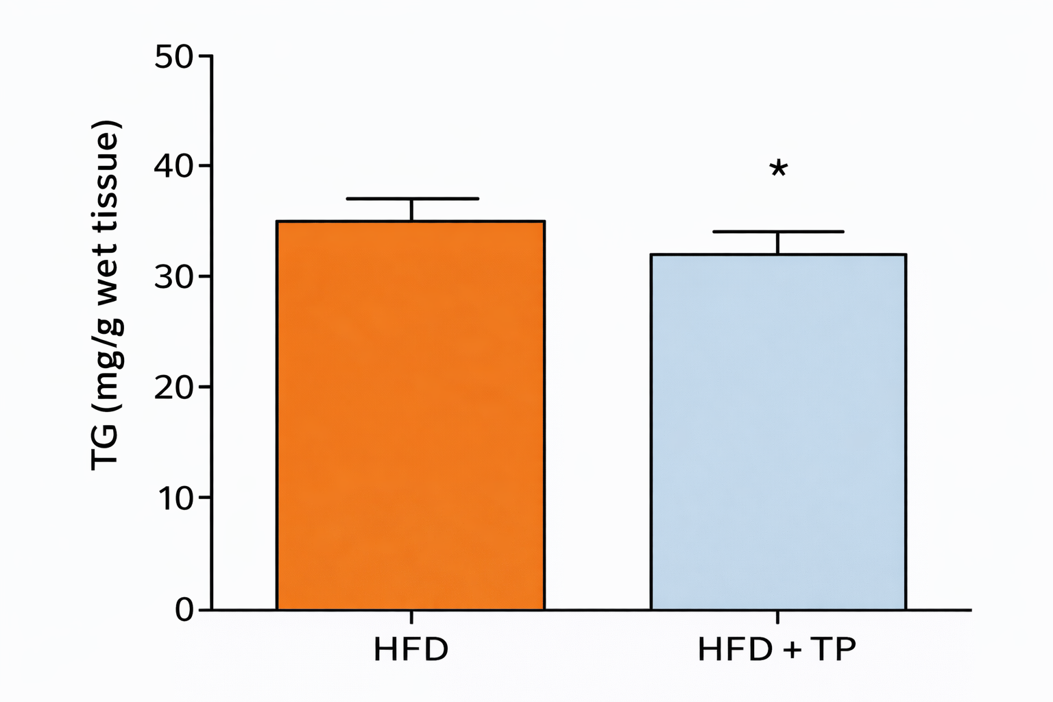 高脂肪食にトマトパウダーを混ぜた飼料をマウスに24週間与えたところ、高脂肪食のみの群と比較して肝臓中の総TG濃度が有意に低下しました。
