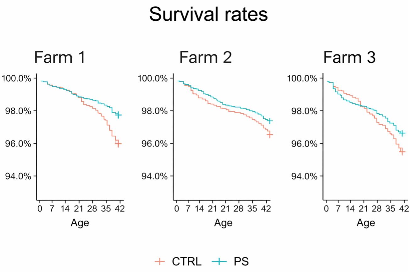 シンバイオティクス投与群(PS)は、対照群(CTRL)と比較して育成期間を通じて一貫して高い生存率を示した。全体の死亡率は、PS群で3.5%、CTRL群で5.3%であり、この差は統計的に有意であった(p < 0.0001)。また、この傾向は3農場すべてで共通して認められた。