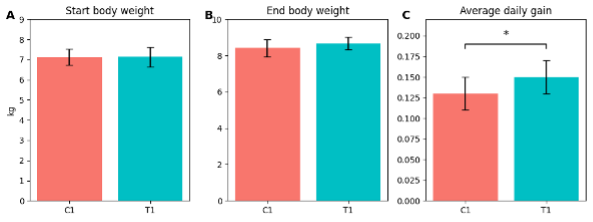 試験開始時の体重は対照群(C1)とプロバイオティクス投与群(T1)で差は認められなかった。一方、平均日増体量(ADG)は、T1群で有意に高値を示した(0.15 ± 0.02 kg/日、p < 0.05)。試験終了時の体重も、T1群でやや高い値を示した。