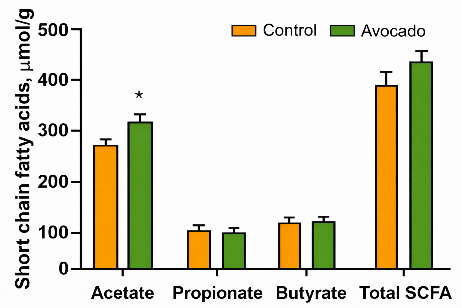 肥満成人を対象とした12週間のアボカド摂取試験において、便中の短鎖脂肪酸のうち酢酸が、対照群と比べてアボカド摂取群で有意に高値を示しました。
