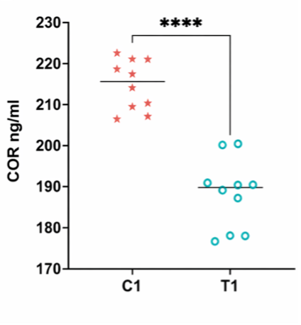 離乳期の子豚を用いた試験においてプロバイオティクス投与群(T1)では、対照群(C1)と比較して血中COR濃度が有意に低下した(p < 0.0001)。