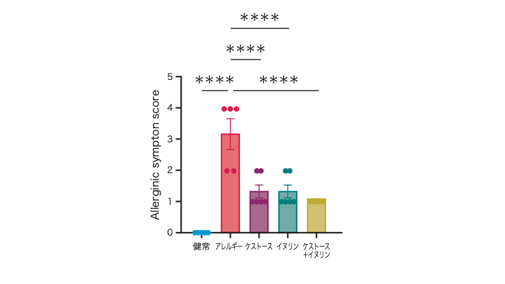 Takahashiらの研究により、食物アレルギーモデルマウスを用いた実験において、イヌリンおよびケストースの単独摂取、ならびに併用摂取のいずれにおいても、食物アレルギー症状の有意な軽減が確認されました。