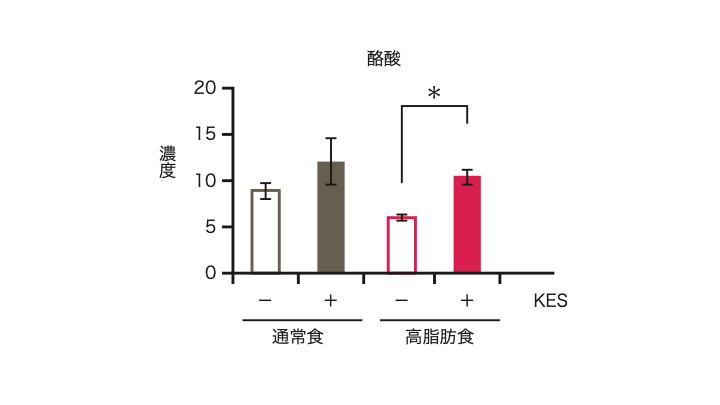 酪酸は腸内で産生される短鎖脂肪酸の一種で、腸管バリア機能や抗炎症作用を持ち、代謝性疾患の予防に寄与するとされています。研究では、1-Kestose摂取によって高脂肪食により減少した酪酸レベルが回復するかを検討しました。