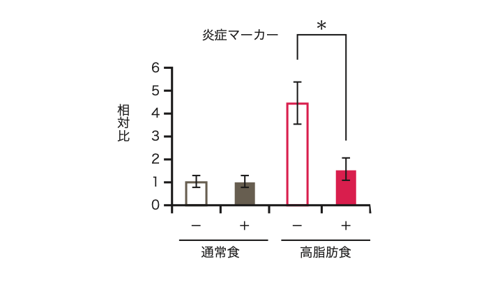 1-Kestoseの摂取は、高脂肪食により上昇した脂肪組織中のTNF-α発現を有意に抑制しました。この結果は、プレバイオティクスが脂肪組織の炎症を軽減し、代謝異常の改善に寄与する可能性を示しています。