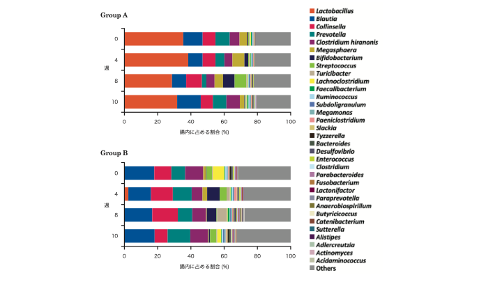 • Lactobacillusは0週で0.1% → 4週で一時的に2.4%まで上昇 → 10週で0.1%に戻る