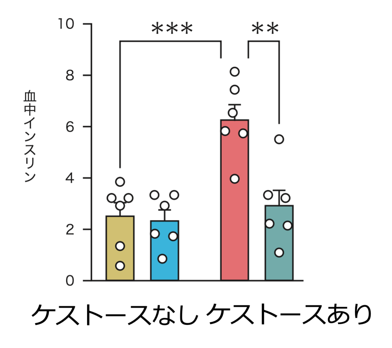 ラットに高脂肪食とケストースを19週間摂取させました。その後、空腹時の血中インスリン濃度を測定しました。その結果、ケストースの摂取によって高インスリン血漿が改善されました。