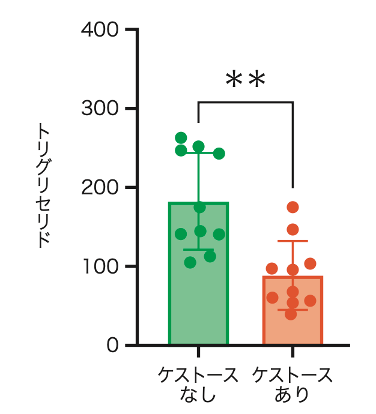ラットに高脂肪食とケストースを2週間摂取させました。その後、血中トリグリセリドを測定しました。その結果、ケストースの摂取によって血中トリグリセリド濃度が減少しました。