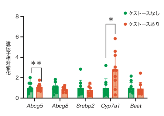 ラットに高脂肪食とケストースを2週間摂取させました。その後、肝臓における遺伝子発現を測定しました。その結果、ケストースの摂取によって胆汁酸合成遺伝子であるCYP7A1の発現が増加しました。