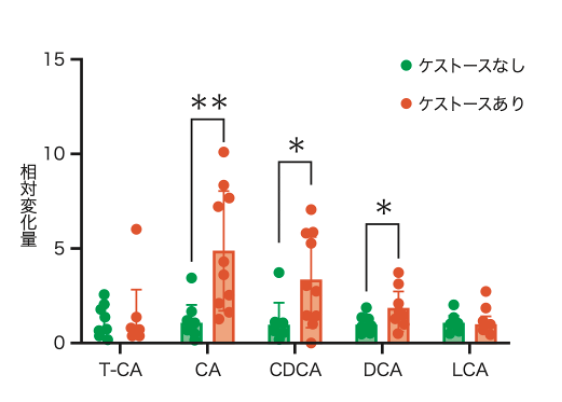 ラットに高脂肪食とケストースを2週間摂取させました。その後、盲腸における胆汁酸量を測定しました。その結果、ケストースの摂取によって1次胆汁酸であるコール酸などの脱抱合型胆汁酸濃度が増加しました。