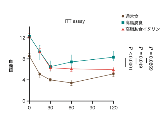 マウスに高脂肪食とイヌリンを16週間摂取させた結果、インスリン投与による早い血糖値減少効果が示されました。