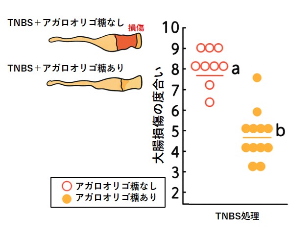TNBS処理後には大腸損傷の増加が引き起こされましたが、その損傷の発生はアガロオリゴ糖を投与されたマウスで有意に抑制されました。