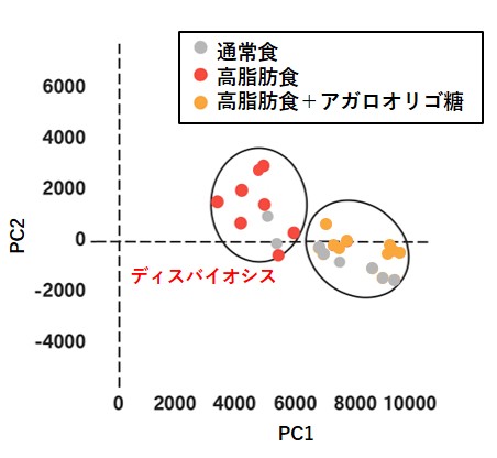 通常の食餌に比べて、高脂肪の食餌をマウスに給餌すると、腸内細菌叢の変化が観察されましたが、その変化はアガロオリゴ糖を投与されたマウスで抑制されました。