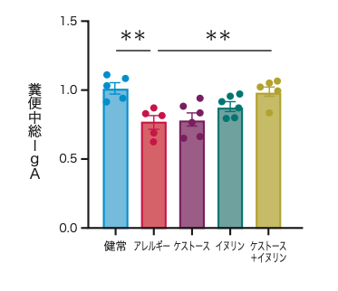 アレルギー誘導されたマウスでは、糞中の総IgA濃度が有意に低下しましたが、ケストースとイヌリンの併用摂取群ではこの低下が有意に抑制されました。これは、腸管免疫の維持に対するプレバイオティクスの有効性を示す結果です。