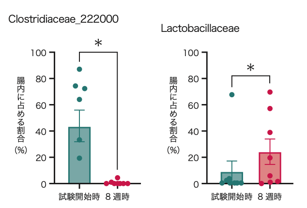 若齢ペンギンにおけるケストースと加熱殺菌L. plantarum FM8の併用投与は、Clostridiaceae属の減少とLactobacillaceae属の増加を引き起こし、腸内環境の有益な変化が認められました。