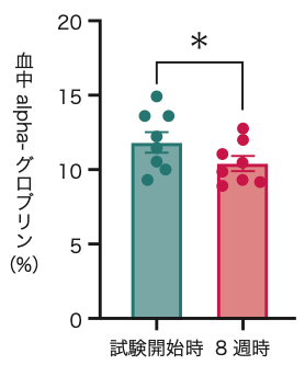 3歳未満の若齢マゼランペンギンにおいて、8週間の投与後、炎症反応に関連する血漿中αグロブリン濃度が有意に上昇しました(P = 0.0234)。これは、腸管内の刺激による免疫応答の活性化や、全身性の防御機構の促進を示す可能性があります。