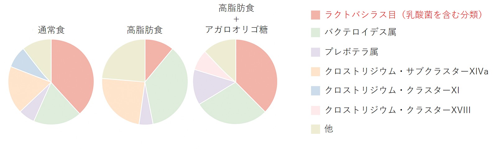 通常の食餌に比べて、高脂肪の食餌をマウスに給餌すると、乳酸菌の著しい減少が観察されましたが、その変化はアガロオリゴ糖を投与されたマウスで抑制されました。