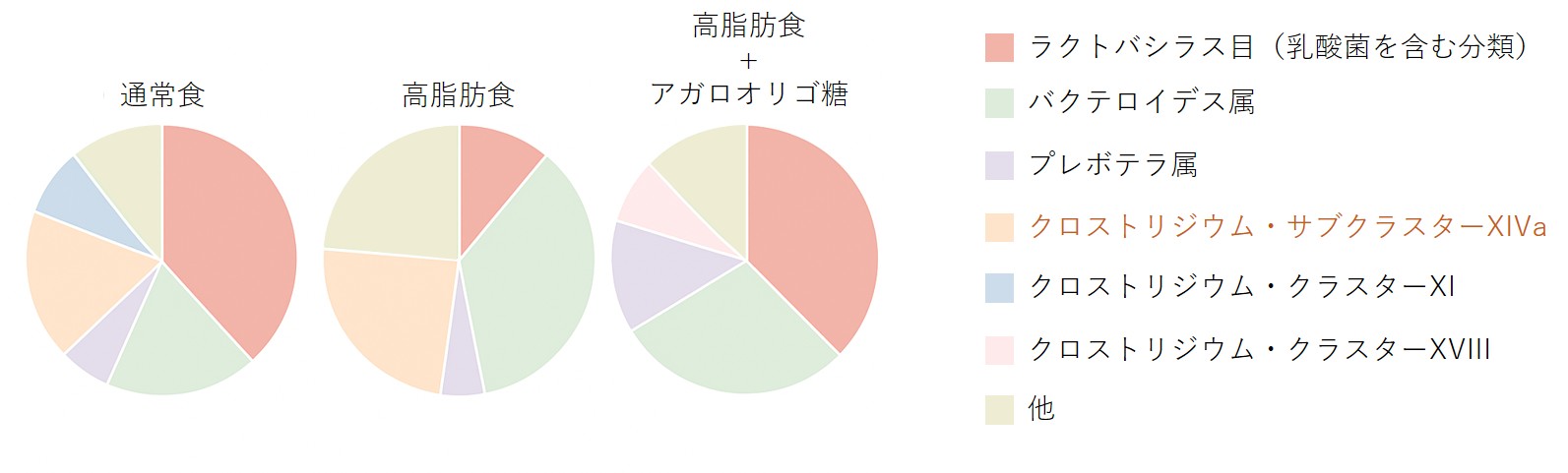 通常の食餌および高脂肪の食餌をマウスに給餌すると、クロストリジウム・サブクラスターXIVaが観察されましたが、アガロオリゴ糖を投与されたマウスでは観察されませんでした。