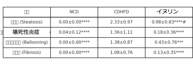 脂肪肝モデルのマウスに対してイヌリンを16週間摂取させました。そして、肝臓の組織学的変化によって評価した結果、壊死性炎症が改善しました