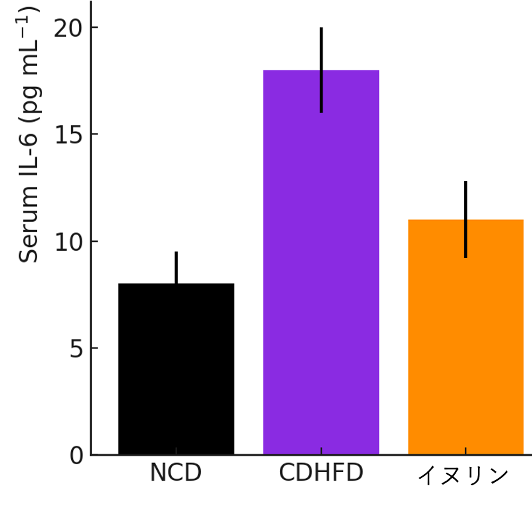 脂肪肝モデルのマウスに対してイヌリンを16週間摂取させました。そして、肝臓の組織学的変化によって評価した結果、炎症性サイトカインであるIL-6が減少しました。