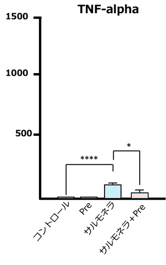 プレバイオティクスは、サルモネラ感染後に上昇するTNF-α発現を抑制し、腸の炎症の増幅や組織障害の進行を防ぐ効果を示しました。