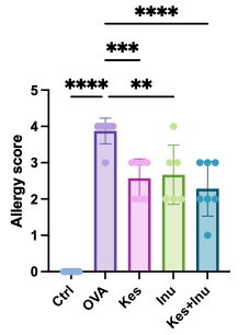 OVAアレルギーモデルマウスでは、Kes群・Inu群・Kes+Inu群のすべてでアレルギースコアが有意に改善しました(p < 0.05)。ただし、併用群と単独群との間に有意差は認められませんでした