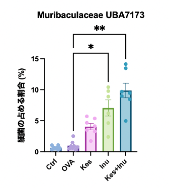 Kes+Inuの併用は、抗アレルギー性腸内菌UBA7173の定着を促進し、免疫応答の調整に寄与する可能性が示されました。